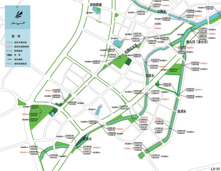 将蓝线落实到坐标,为海绵措施提供空间保障。按照建设区和非建设区划定建(构)筑物退河道边线最小距离,提出保护策略。
